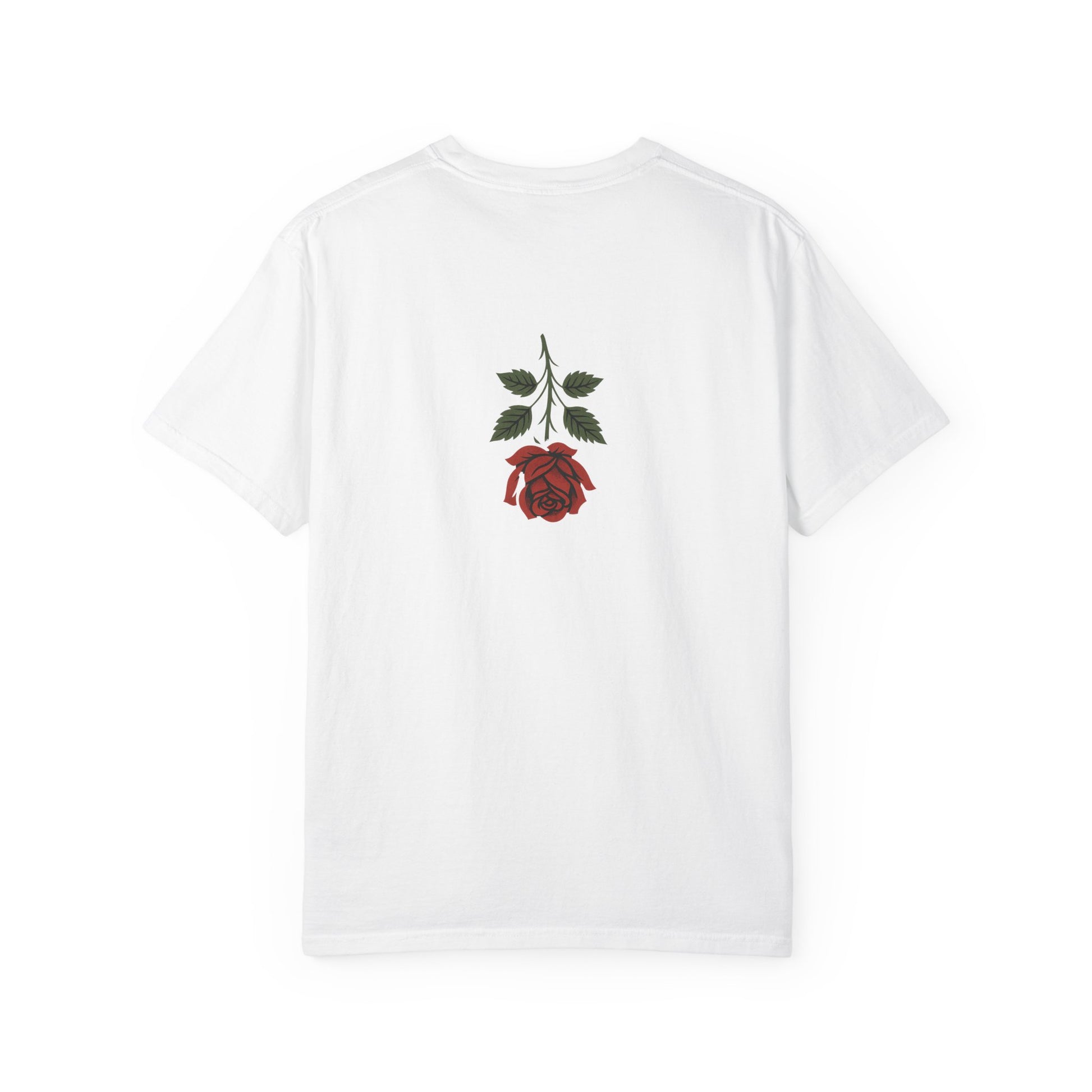 A comfortable unisex T-shirt featuring a charming flower design. This garment-dyed tee is perfect for those who enjoy a relaxed fit and classic crew neckline. Ideal for casual wear or accessorizing in both casual and semi-formal settings. Suitable for adults, this T-shirt is made from high-quality, pre-shrunk 100% ring-spun US cotton for long-lasting comfort. Available in multiple sizes and 58 different colors, making it a versatile addition to any wardrobe. Great for everyday wear, special events, holidays, and gifting occasions.